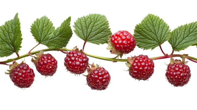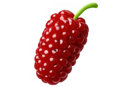 Ripe red mulberry close-up, displaying deep crimson hue, textured surface, green stem, positioned against transparent backdrop
