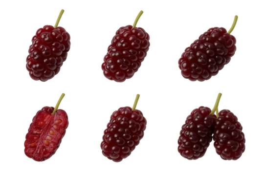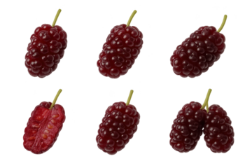 Red mulberry clipart set with whole berries, halves and detailed textures. Ideal for botanical, food, natural and design projects.