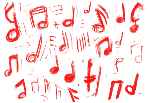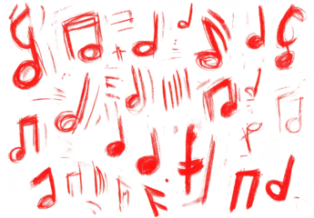Abstract composition of red musical notes scattered across a white background. creating a and dynamic atmosphere. suitable for music-related projects or artistic expressions