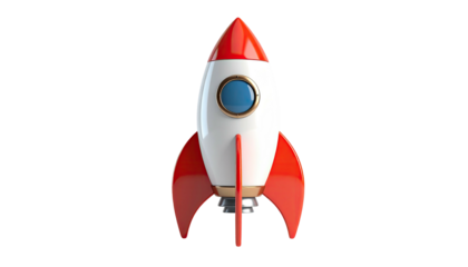 A stylized, cartoon rocket with red fins, white body, and red nose