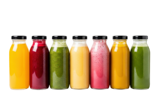 seven chilled, cylindrical glass bottles of cold-pressed, colorful juices and smoothies displayed against a transparent cyclorama background, commercial product photography style. Concept of