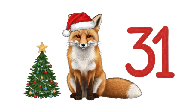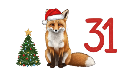 Cute Fox Wearing Santa Hat with Christmas Tree and Red Number 31 Illustration isolated PNG with Transparent Background