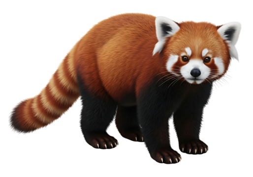 A red panda sitting and looking to the side with a fluffy tail on a transparent background
