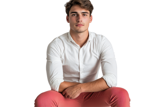 Handsome young man sitting confidently with arms crossed, wearing white shirt and red pants in minimalist indoor setting during bright daylight