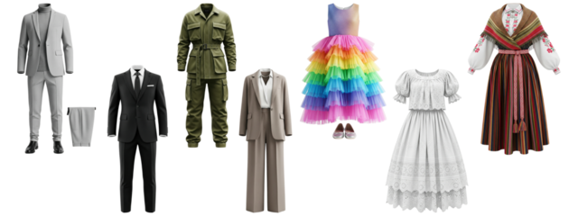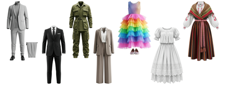 Collection of different clothing, including formal suits, a safari outfit, and folk dresses