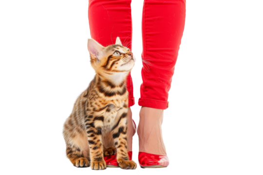 Woman in red pants & shoes, with Bengal kitten sitting on her foot. Isolated on white background.