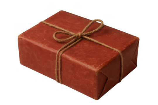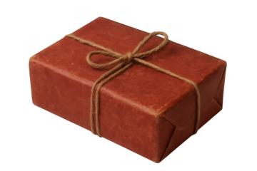 Vintage parcel with red wrapping paper and twine bow, delivering packages and mail service concept on transparent background