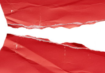 Two torn pieces of red paper with rough textured edges are isolated against a clean transparent background