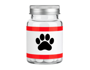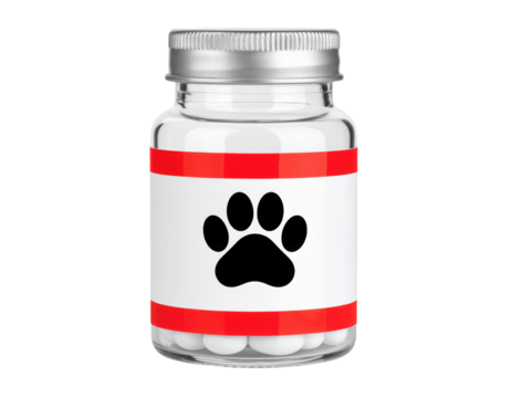 A clear medicine bottle with white pills inside and a label featuring a black paw print bordered by two red stripes.