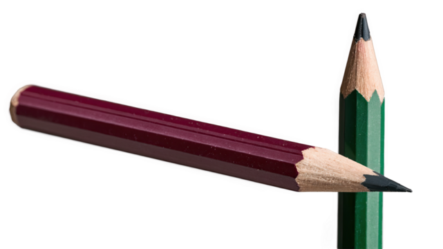 Two red pencils, one with a gray graphite lead, intersect in a dynamic pose