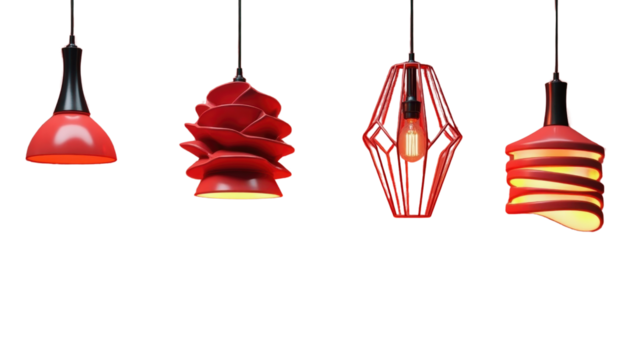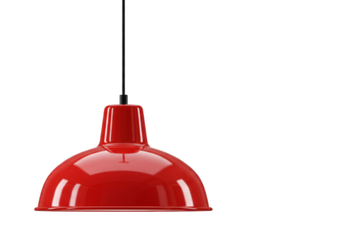 Hanging red pendant lamp with exposed bulb, downward angle, isolated PNG