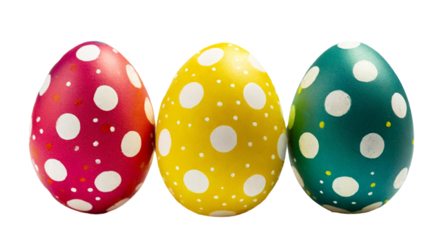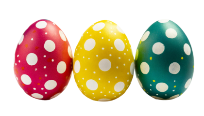 Cute bunny among colorful polka dot easter eggs on transparent background