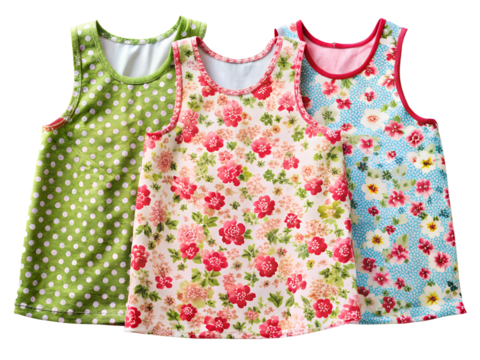 Three childrens dresses with floral and polka dot patterns isolated on transparent background