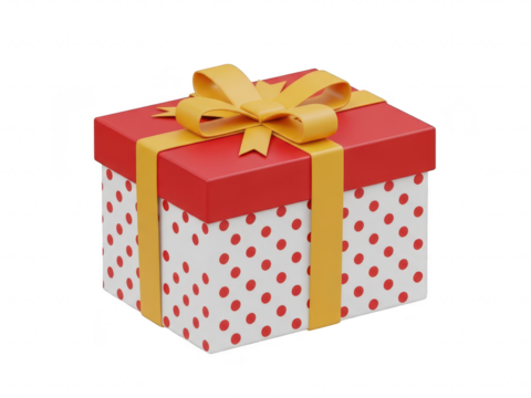 Red gift box with yellow ribbon and polka dots isolated on transparent background for holiday or present concepts
