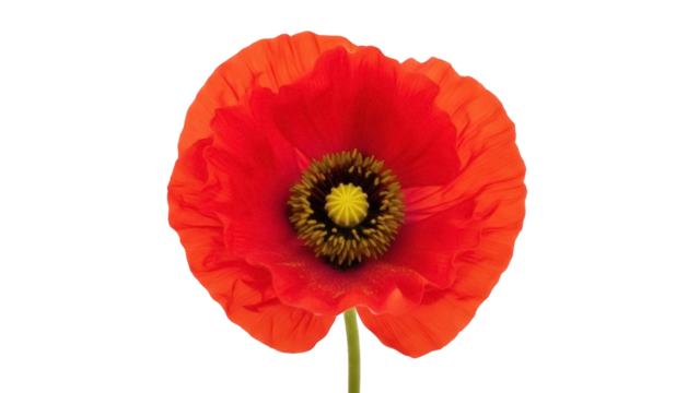 A vibrant red poppy flower is isolated on transparent background, showcasing its delicate petals and intricate center