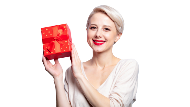 Blonde woman unwrapping red gift with transparent background