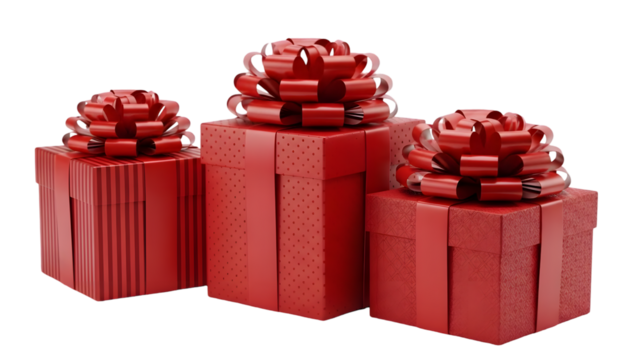 Festive red gift boxes with white ribbons on transparent background