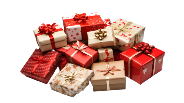 Pile of Christmas gifts wrapped in red and green paper with ribbons on a white background.  PNG transparent.