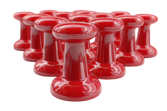 A vibrant array of translucent red pushpins, essential for organization and securing documents, scattered on a clean white background, symbolizing efficiency in any workspace