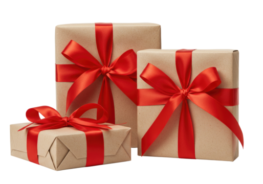 Three elegantly wrapped presents with red ribbons, arranged in a row, set against a clean background, ideal for holiday promotions, gift-giving occasions, or festive celebrations