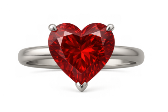 Silver ring featuring a large heart-shaped red gemstone, symbolizing love, passion, and romance, on a transparent background