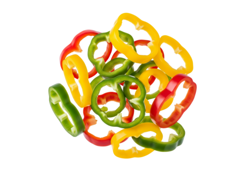 Vibrant Mixed Bell Pepper Rings Isolated on White - Fresh Red, Green, Yellow Slices for Healthy Recipes