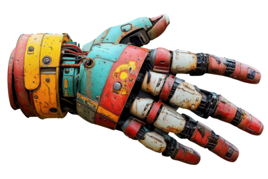 Mechanical Offering: A robotic hand tenderly cradles a vibrant red rose, symbolizing the fusion of technology and the timeless beauty of nature.