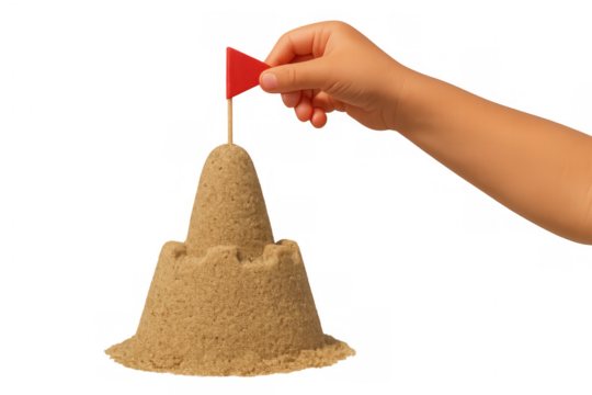 Child's hand placing red flag on sandcastle, symbolizing achievement, success, and setting goals