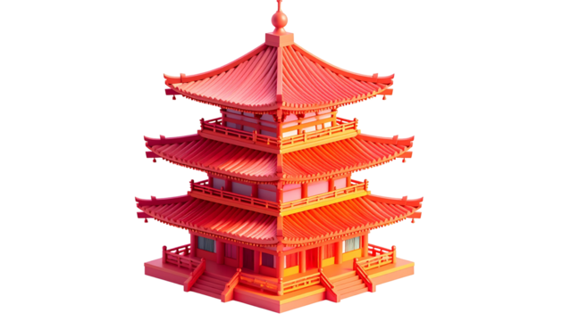 A vibrant, detailed three-tiered pagoda with red tones against a black background