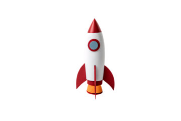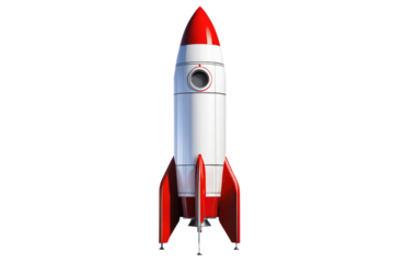A vintage-style rocket with a red cone, white body, and single blue window, standing on red fins, with a fiery orange thruster at the base, isolated on a transparent background