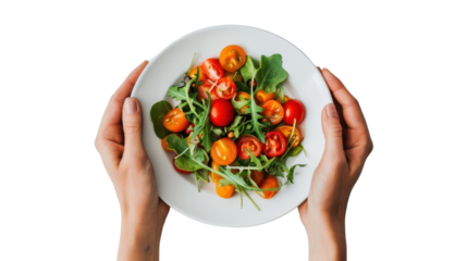 Woman holding a plate of fresh salad with cherry tomatoes and arugula on transparent background