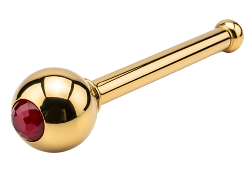Polished gold rod with a brilliant red gemstone accents a decorative fixture.