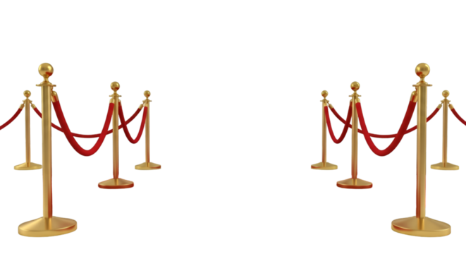 Three gold stanchions with red ropes isolated on a transparent background