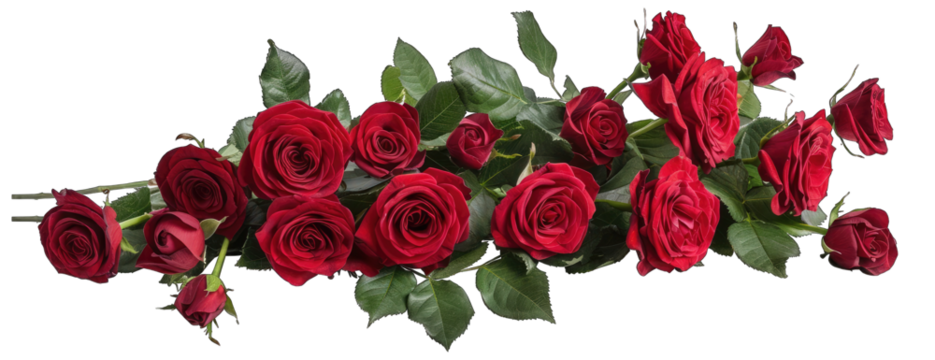 Elegant cascading arrangement of radiant red roses with verdant foliage, isolated