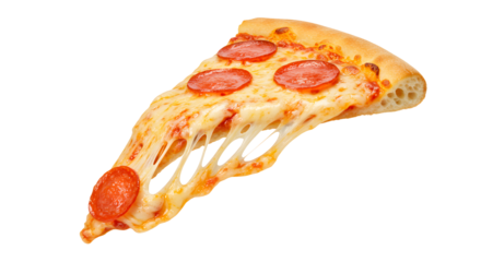 Delicious slice of classic Italian pizza with stringy melted mozzarella cheese being lifted from a freshly baked whole pie, transparent PNG