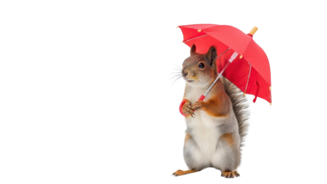 Red squirrel holding a red umbrella isolated PNG with Transparent Background