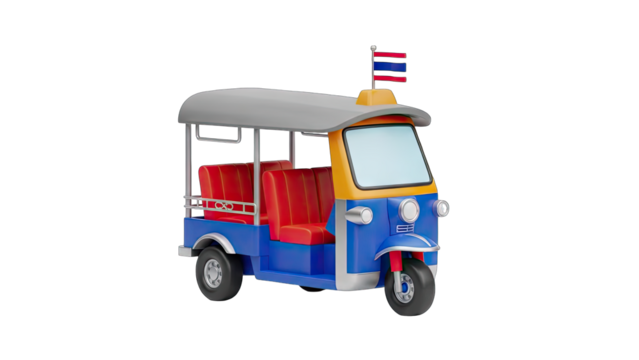Bright Blue and Yellow Tuk Tuk Taxi With Red Seats and Thailand Flag on a Transparent Background