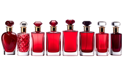 Seven red perfume bottles with varying shapes and ornate stoppers, arranged linearly against black