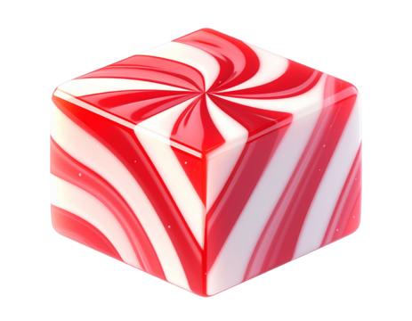 A glossy, cube-shaped confection with a red and white spiral pattern