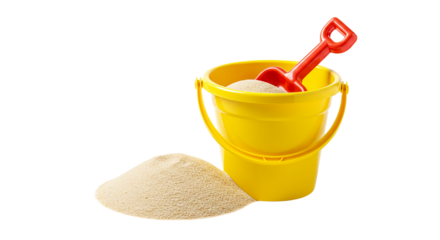 ultra-detailed photorealistic still life of glossy primary yellow plastic toy bucket and red shovel on a transparent backdrop, bright high-key lighting, concept of summer childhood joy