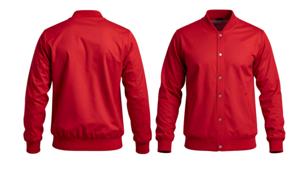 Front & back view of a bright red bomber jacket on a black background