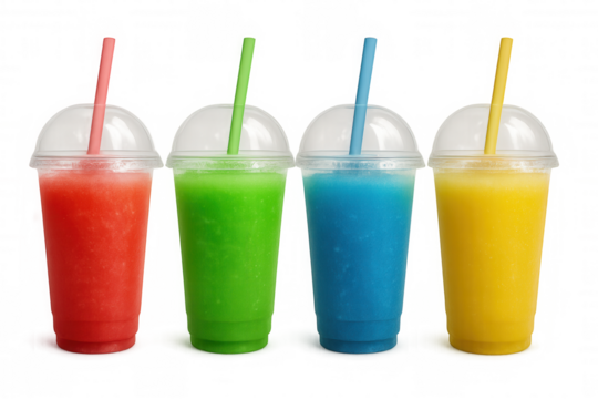 Four colorful frozen slush drinks in plastic cups with straws, offering refreshing summer flavors