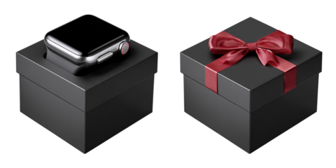 Smartwatch in black gift box with red ribbon, luxury present for special occasion, modern technology and elegant packaging