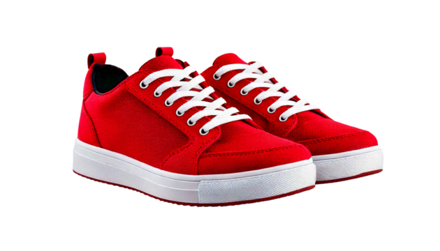 Pair of red low top sneakers, with white laces and white soles isolated on a white or transp.png