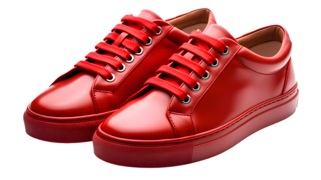 Pair of  red leather shoes, red sneakers isolated, transparent PNG background