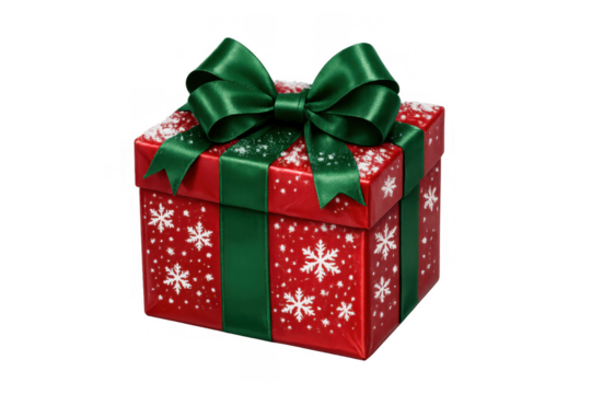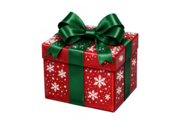 Christmas gift box in red color with snow theme and green ribbon for holiday celebration on transparent background