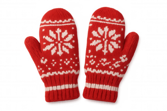 Cozy red and white fair isle knit mittens with snowflake pattern isolated on transparent background