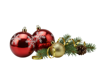 Two high-gloss red snowflake baubles and gold ornament with fir, pine cone, and gold ribbon on a gray studio background, soft natural light, concept of luxurious festive elegance