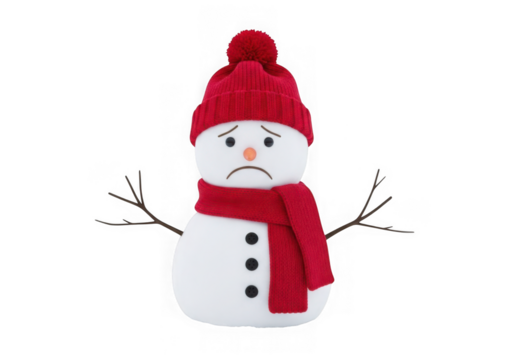 A single adorable snowman with a red knitted hat and scarf, smiling cheerfully isolated on transparent background