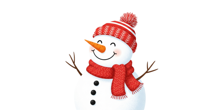 Cheerful snowman wearing red scarf and top hat with twig arms isolated on transparent background